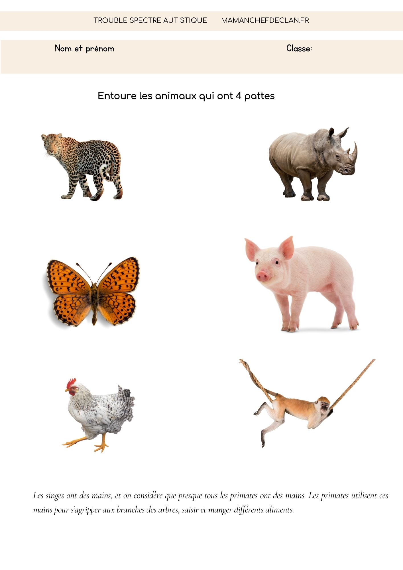 Un exercice spécialement conçu pour mon garçon avec un trouble du spectre autistique. Ici, les animaux ressemblent à de vrais animaux et ne sont pas des dessins. De plus, il y a un point spécial sur le singe qui peut amener différentes réflexions et sert à aiguiser la curiosité de l’enfant.